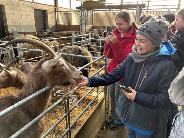 Außerdem haben wir drei frisch geborene Lämmer gesehen, durften sie füttern, haben ihnen frisches Wasser gegeben und haben mit Igor I. ein Selfie gemacht. Eigentlich gab es noch Hühner, die aber wegen der Geflügelgrippe nicht auf dem Hof waren, genauso wie die Schweine, die wegen der afrikanischen Schweinepest nicht auf dem Hof gehalten konnten. Sonst hätten wir den Bauernhof nicht besuchen dürfen.