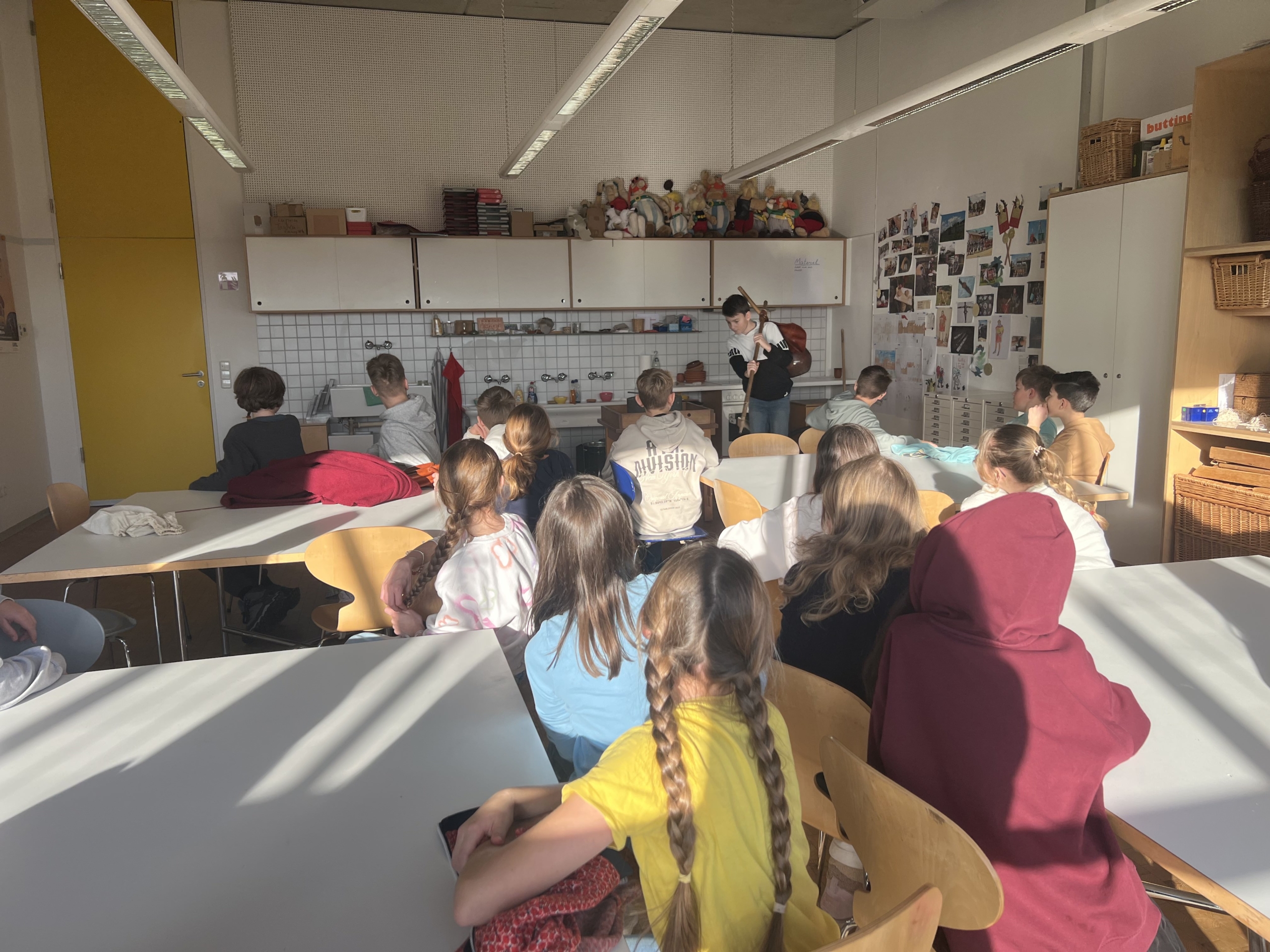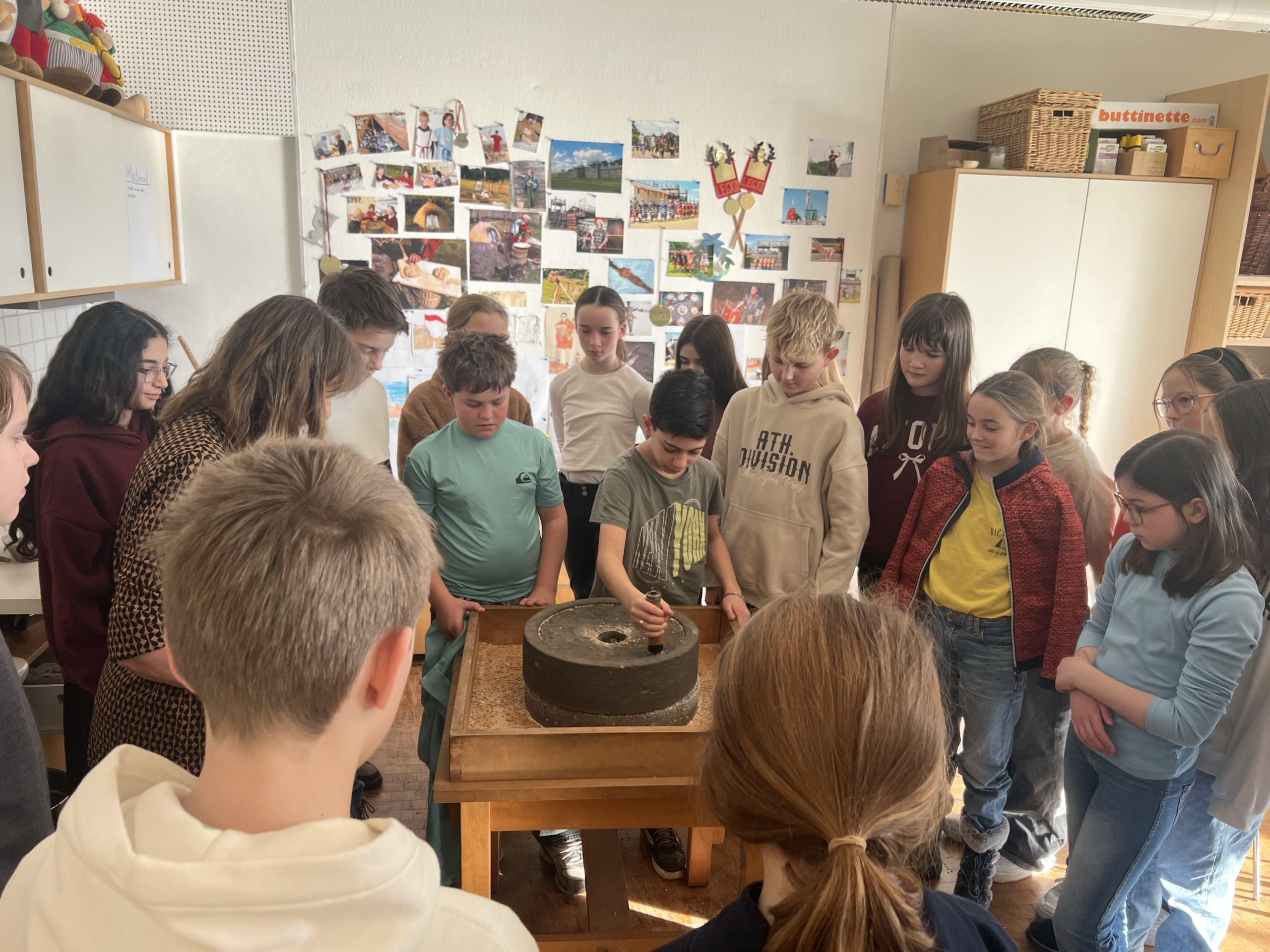 Für große Begeisterung sorgten auch die vielen Playmobil-Figuren, die Menschen aus der Römerzeit darstellten. Diese waren liebevoll gestaltet und zum Beispiel als Soldaten verkleidet. Dadurch konnten sich die Schülerinnen und Schüler das Leben der Römer besonders gut vorstellen. Ein weiteres Highlight war, dass alle selbst aktiv werden durften. Die Kinder konnten römische Kleidung anprobieren und ausprobieren, wie früher Mehl gemahlen wurde. So wurde Geschichte für alle hautnah erlebbar.