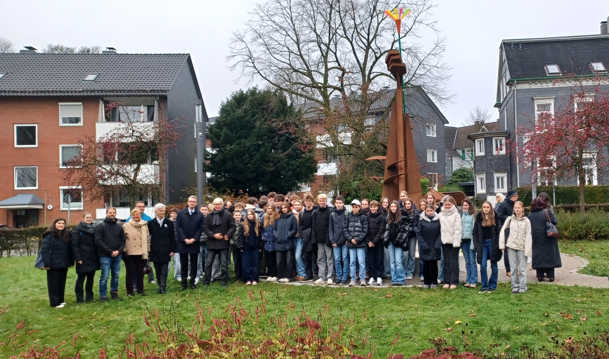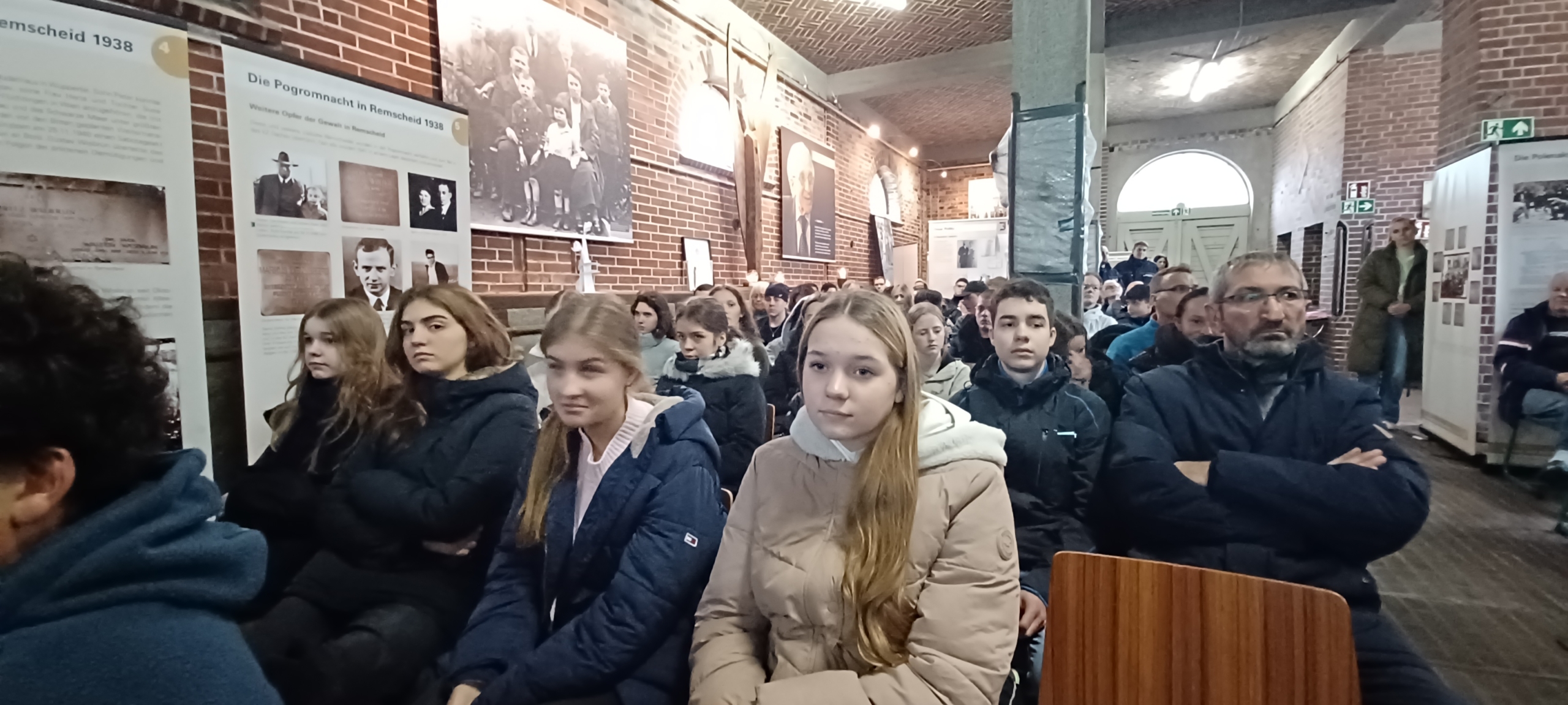 Zusammen mit Herrn Franke, Frau Führing, Frau Buga und Herrn Tissot konnten sie sehr berührende Reden und yiddische Musik hören. Auch der Oberbürgermeister von Remscheid, Sven Wolf, hielt eine sehr interessante und zum Nachdenken anregende Rede. Herr Schumacher, der Vorsitzende der Bildungsstätte Pferdestall, sowie Johannes Kessler, ein Mitglied des Bergischen Geschichtsvereins und außerdem ehemaliger Kollege des Leibniz-Gymnasiums, richteten einige ergreifende Worte an uns.