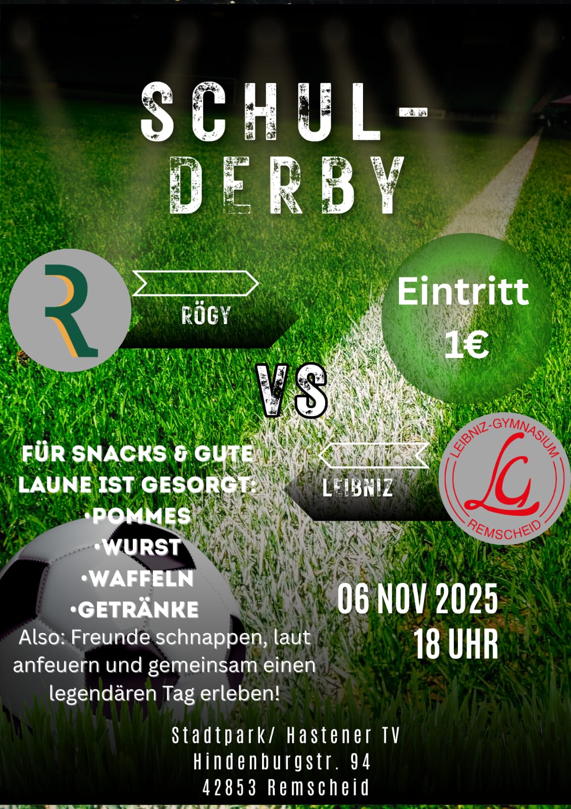 Am Donnerstag, dem 06.11.2025, um 18:00 Uhr wird die Q1 gegen die Q1 des Rögys ein Fußballspiel austragen. Wir wollen das Team der Rögys gerne besiegen und brauchen dafür eure tatkräftige Unterstützung. Wir würden uns sehr freuen, euch am Donnerstag am Spielfeldrand jubeln zu hören. Das Match findet im Stadion am Stadtpark in der Hindenburgstraße 94 in Remscheid statt.